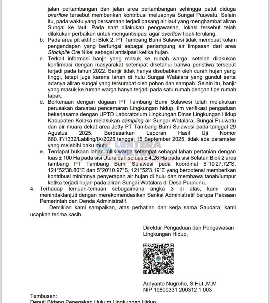 “Oleh karena itu, Kementerian Lingkungan Hidup, dalam hal ini deputi bidang penegakan hukum Kemen LH merekomendasikan sanksi berupa paksaan pemerintah dan sanksi administratif kepada TBS,” kata Ardyanto Nugroho, S.Hut.,M.M, Direktur Pengaduan dan Pengawasan Lingkungan Hidup, dalam suratnya bernomor B.939/I.1/GKM.2.1/09/2025 yang ditujukan kepada Lingkar Kajian Kehutanan Sulawesi Tenggara, 23 September lalu.