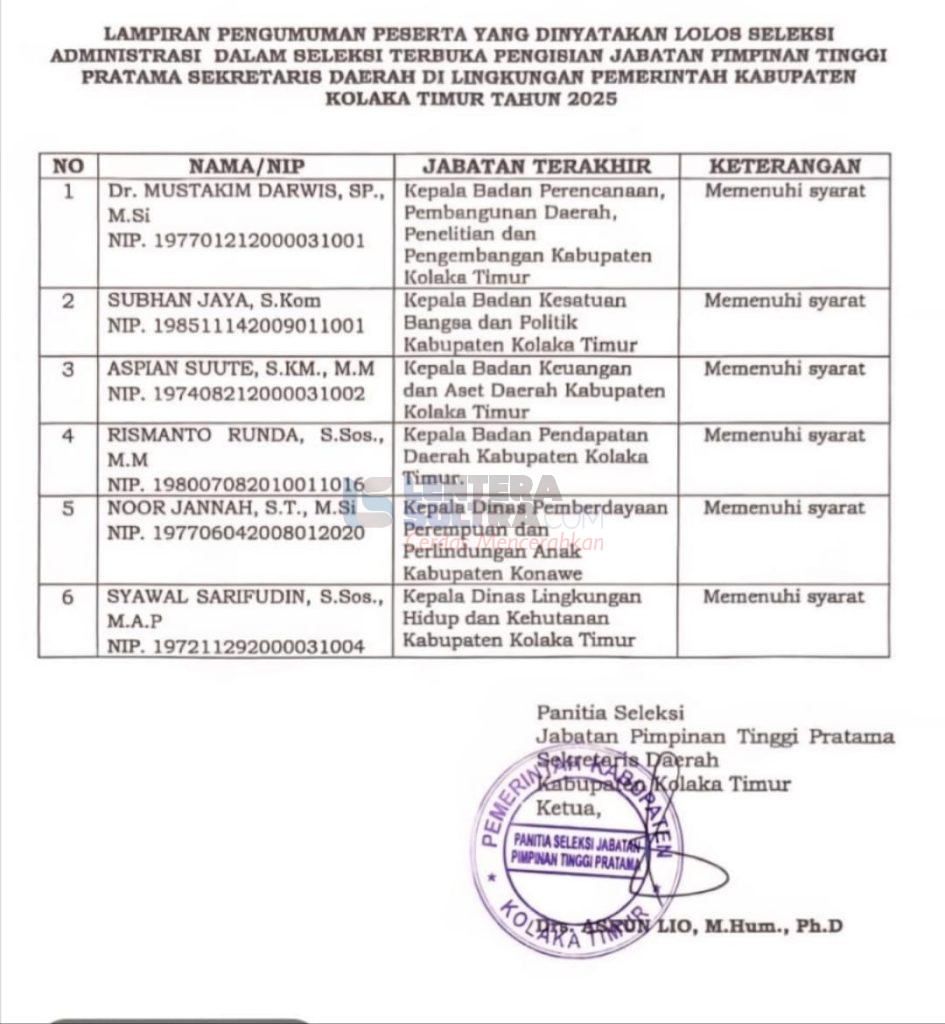 TIRAWUTA, LENTERASULTRA.COM-Kursi Sekretaris Daerah (Sekda) Kolaka Timur yang lama ditinggalkan Iqbal Tongasa tak lama lagi bakal terisi. Enam pamong senior dan memenuhi syarat kepangkatan resmi mendaftarkan diri dan dinyatakan lulus seleksi administrasi. Panitia pun sudah mengumumkan nama-nama mereka. Menariknya, ada satu nama perempuan yang ikut bersaing, dan berasal dari luar Kolaka Timur.