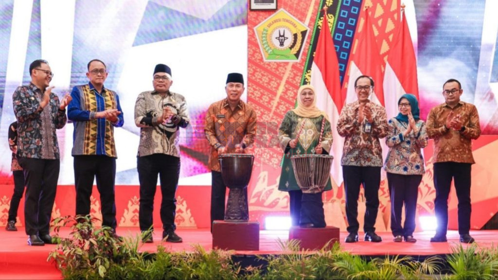 Gubernur Sultra, Andi Sumangerukka dan Gubernur Jatim, Khofifah Indar Parawansa didampingi pejabat dari masing masing daerah, menabuh gendang sebagai tanda dimulainya kerja sama kolaborasi misi dagang dan investasi antar dua daerah. FOTO :PEMPROV SULTRA