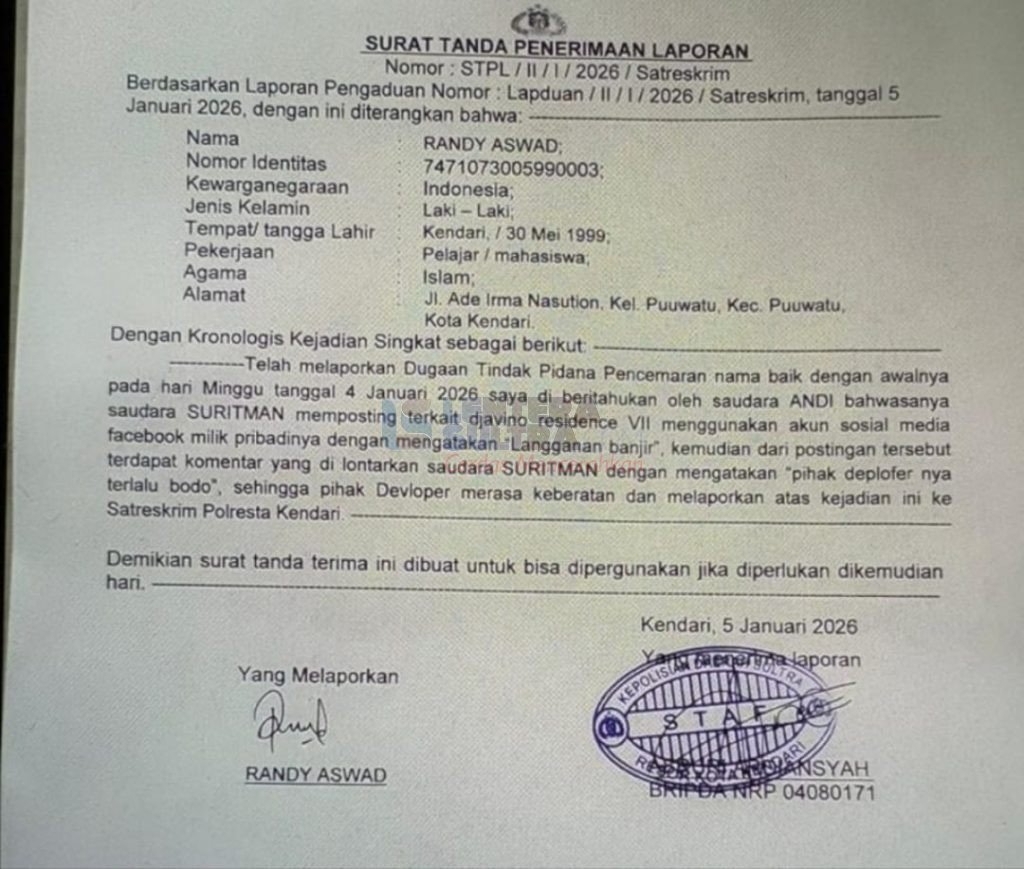 Laporan yang membuat mantan anggota DPRD Bombana itu uring-uringan tersebut masuk ke Polres Kendari, 5 Januari 2026 lalu. Pelapornya, Randy Aswad yang dalam Surat Tanda Penerimaan Laporan (STPL) berstatus mahasiwa/pelajar. Randy mewakili pengembang melapor atas dugaan pencemaran nama baik. Mereka tak terima atas unggahan Suritman di media sosial, suasana banjir di kawasan itu dimana salah satu yang jadi korban adalah dirinya.