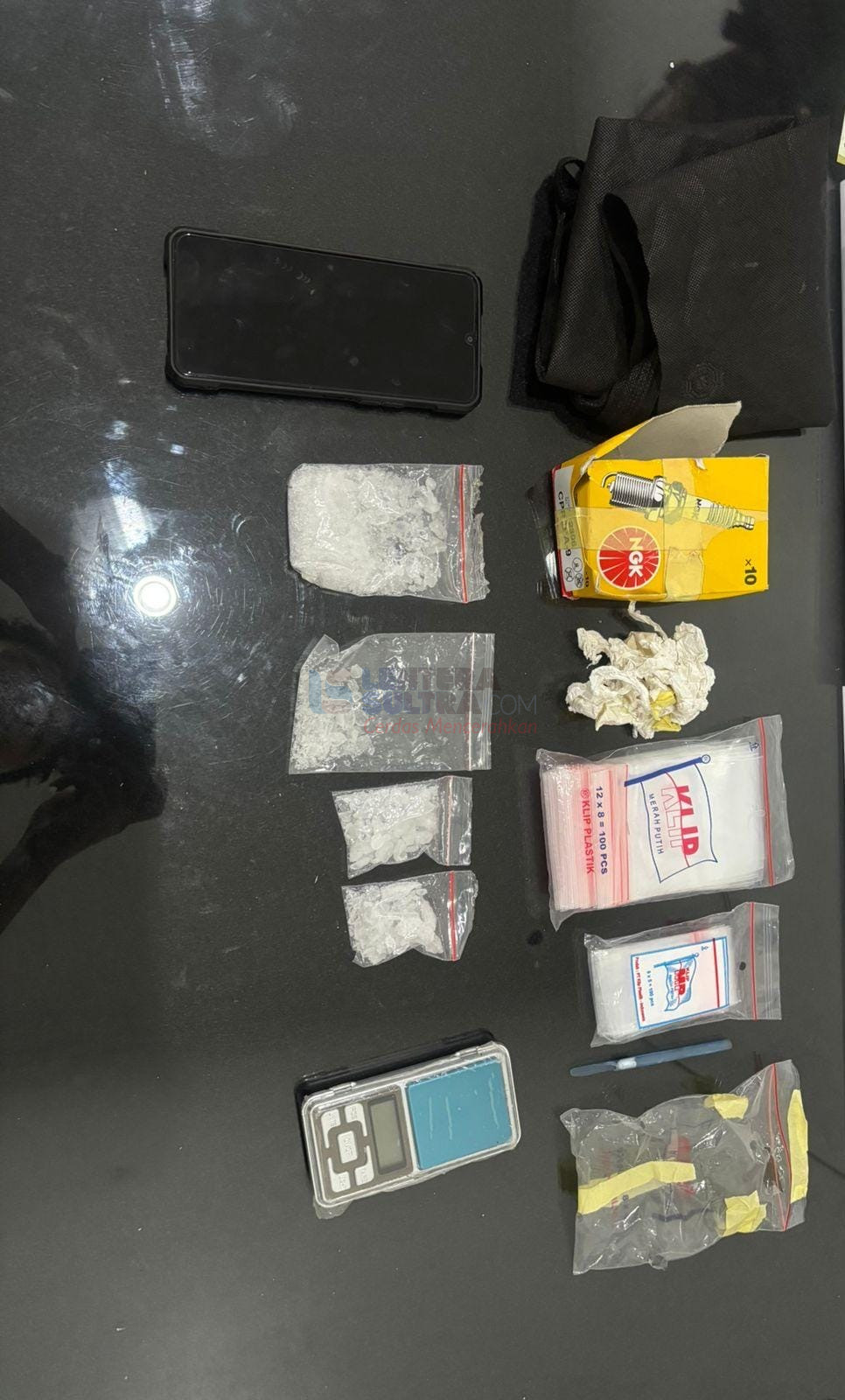 Dalam penggeledahan tersebut, polisi menemukan satu kantong kain warna hitam berisi empat saset sabu dengan berat bruto sekitar 65 gram. Selain itu, sejumlah barang bukti non-narkotika turut diamankan. Barang bukti yang disita antara lain satu unit telepon genggam, satu timbangan digital, puluhan saset plastik kosong berbagai ukuran, sendok sabu dari pipet, tisu, serta kotak pembungkus busi yang diduga digunakan dalam aktivitas peredaran narkotika.