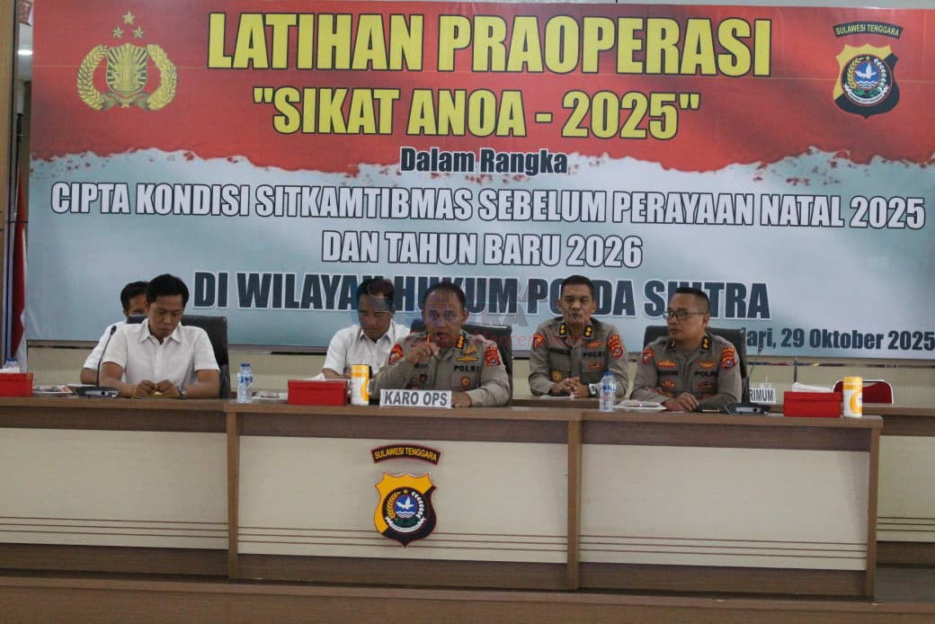 KENDARI, LENTERASULTRA.COM – Kepolisian Daerah Sulawesi Tenggara (Polda Sultra) menggelar kegiatan Latihan Praoperasi “Sikat Anoa 2025” dalam rangka menciptakan situasi keamanan dan ketertiban masyarakat (Siskamtibmas) yang kondusif menjelang perayaan Natal 2025 dan Tahun Baru 2026.