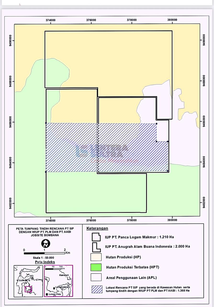 Menariknya, dalam lampiran surat PMPTSP tersebut juga ditampilkan peta rencana kawasan SIP yang ternyata banyak yang tumpang tindih dengan izin perusahaan lain yakni IUP PT Panca Logam Makmur (PLM) dan PT Anugerah Alam Buana Indonesia (AABI).